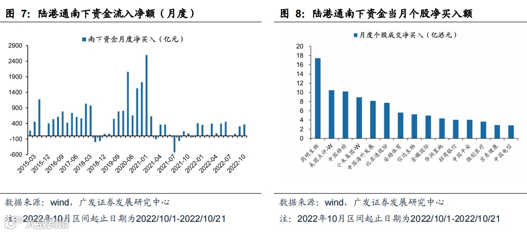 2022年10月(截至10月21日),南下资金净流入369亿元。当月净买入个股前五为药明生物、美团点评-W、中国移动、小米集团-W、中国海外发展。