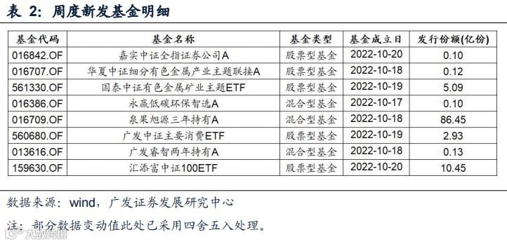 (3)新发基金(股票型+混合型):上周新发基金规模为105亿元,前一周新发基金规模为20亿元,上周新发基金规模扩张。