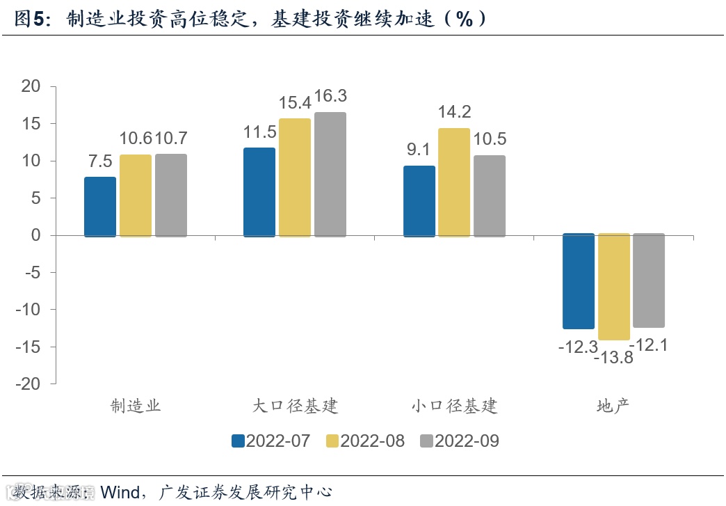 从固定资产投资主要分项来看,9月制造业投资当月同比10.7%,高于前值的10.6%;大口径基建投资当月同比16.3%,高于前值的15.4%;地产投资当月同比-12.1%,高于前值的-13.8%。