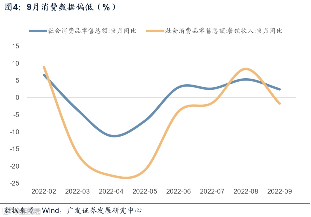 9月消费和服务业数据为何偏低?我们理解主要还是区域疫情和加强防范的影响。对此相对更敏感的餐饮收入9月同比增速再度回落至负增长;前期出来的服务业PMI也较前值明显回落。[2]9月8日联防联控机制新闻发布会曾指出,国庆假期及前后的防控措施执行时间为2022年9月10日起到10月31日止。从耐用消费品来看,汽车、手机等领域受影响偏小,增速偏高。