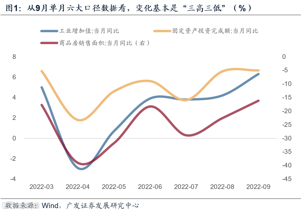 从9月单月六大口径数据看,变化基本是“三高三低”。工业较前值走高,亦明显好于市场预期;投资增速略高于前值;地产销售降幅有所收窄,和高频数据亦指向一致;出口、消费、服务业均低于前值,由于高频数据已预示货物吞吐量放缓及工业开工率普遍偏强,但代表城市内居民生活半径的地铁客运数据偏低等特征,所以结果在市场预期之内。