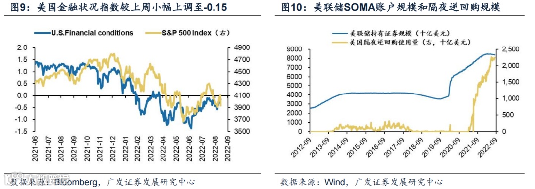 (1)美联储量价配合,货币政策紧缩持续。美联储量价配合,货币政策紧缩持续。7月28日,美联储公布7月议息决议,宣布上调联邦基准利率75BP至2.25%-2.5%,致力于控制通胀水平回到2%目标,符合市场预期。6月以来,美国进入量价配合的紧缩阶段,9月起缩表规模上限提高至950亿美元(600亿国债+350亿MBS和机构债)。但截至9月13日,美联储隔夜逆回购使用量仍达2.202万亿美元,可作为“缓冲垫”对冲缩表带来的影响。