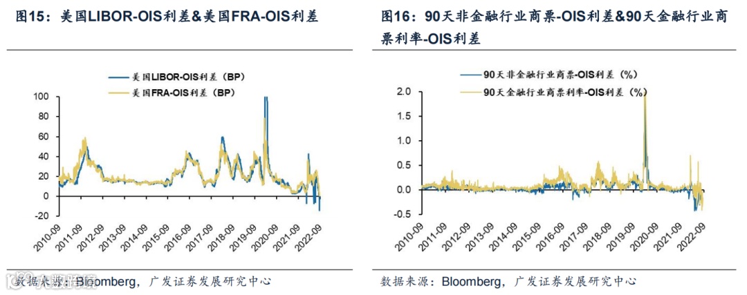 (4)美元流动性整体平稳。美国LIBOR-OIS利差、美国FRA-OIS利差上周以来收窄, 截至2022年9月13日分别达到-14.1BP、1BP。90天金融行业商票利率-OIS利差持续 震荡,截至2022年9月12日达-0.1675%。
