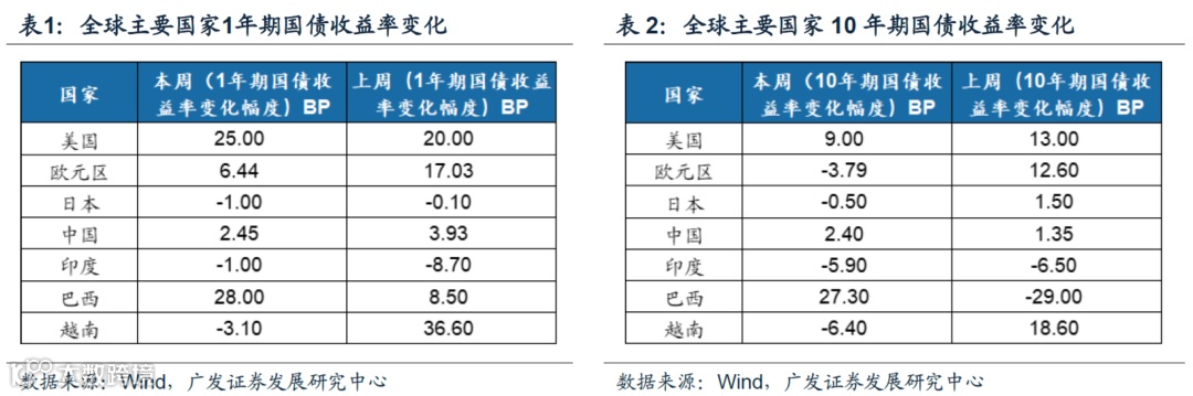 (1)本周全球国债收益率表现分化,美债长短端利率均有所抬升。1年期国债收益率中,美国(升25.00 BP)、欧元区(升6.44 BP)、中国(升2.45 BP)、巴西(升28.00 BP)上行;日本(降1.00 BP)、印度(降1.00 BP)、越南(降3.10 BP)下行。10年期国债收益率中,美国(升9.00 BP)、日本(升0.30 BP)、中国(升2.40 BP)、巴西(升27.30 BP)上行;欧元区(降3.79 BP)、日本(降0.50 BP)、印度(降5.90 BP)、越南(降6.40 BP)下行。