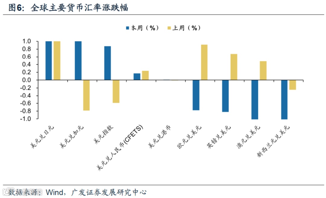 (2)上周美元指数下跌,多数国家货币相对美元升值。美元指数下跌0.59%,欧元兑美元(涨0.91%)、美元兑加元(跌0.78%)、英镑兑美元(涨0.68%)、澳元兑美元(涨0.48%);少数国家货币相对美元贬值,美元兑日元(涨1.70%)、新西兰元兑美元(跌0.25%)、美元兑人民币(涨0.24%)。