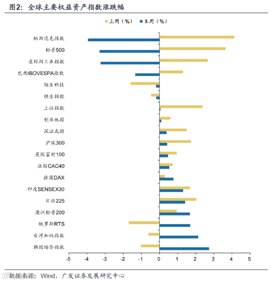 (2)上周全球权益资产总体走强。上周美股领涨:纳斯达克指数(涨4.14%)、标普500(涨3.65%)、道琼斯工业指数(涨2.66%);A股普涨:上证指数(涨2.37%)、沪深300(涨1.74%)、深证成指(涨1.50%)、创业板指(涨0.60%)。上周跌幅最大为俄罗斯RTS(跌1.70%)、其次恒生科技(跌1.60%)、韩国综合指数(跌1.04%)、台湾加权指数(跌0.61%)、恒生指数(跌0.46%)。