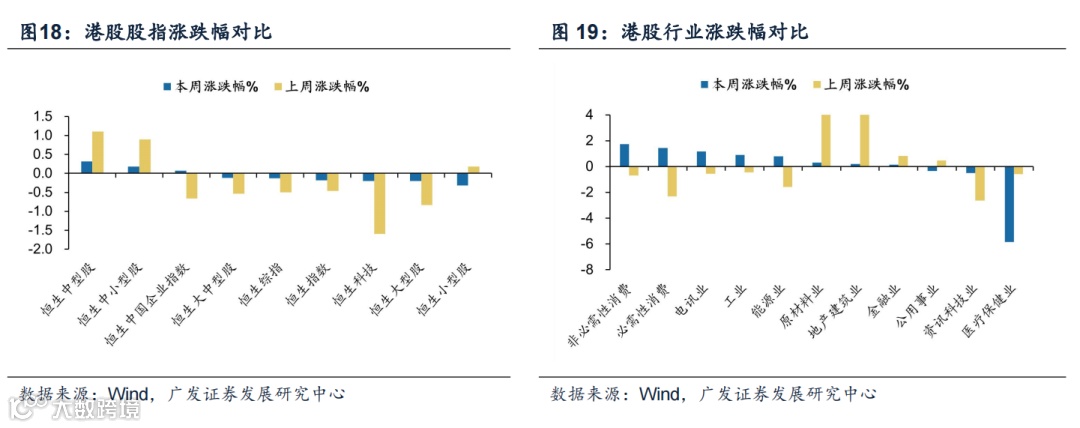 (1)本周港股延续下跌。截至9月13日,本周恒生指数收跌0.18%,恒生科技收跌 0.20%。上周港股整体下跌,恒生指数收跌0.46%,恒生科技收跌1.60%。