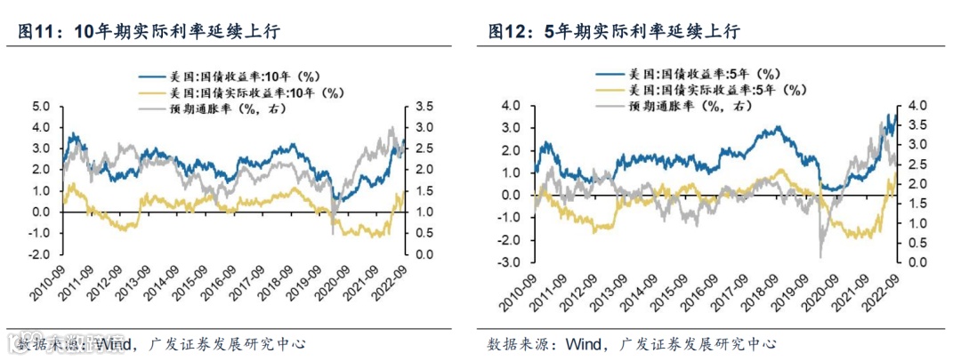 (2)美债利率延续上行,实际利率上行拉动明显。截至2022年9月13日,美国5年期和10年期国债利率分别为3.58%和3.42%。北京时间9月13日晚间,美国公布8月CPI数据。超预期通胀数据公布后,昨晚长短端美债利率集体飙升,市场“紧缩预期”再度强化,具体表现为实际利率上行明显。