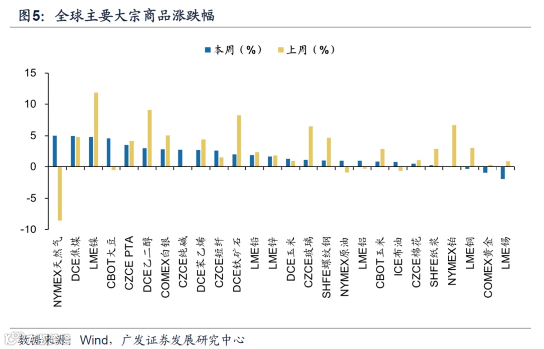 (1)本周大宗商品普涨,化工产品>农产品>有色金属>能源>贵金属。本周天然气(涨5.02%)领涨,其次为焦煤(涨4.96%)、镍(涨4.81%)。锡(跌1.96%)领跌,随后黄金(跌0.95%)、铜(跌0.34%)、铂(跌0.02%)。