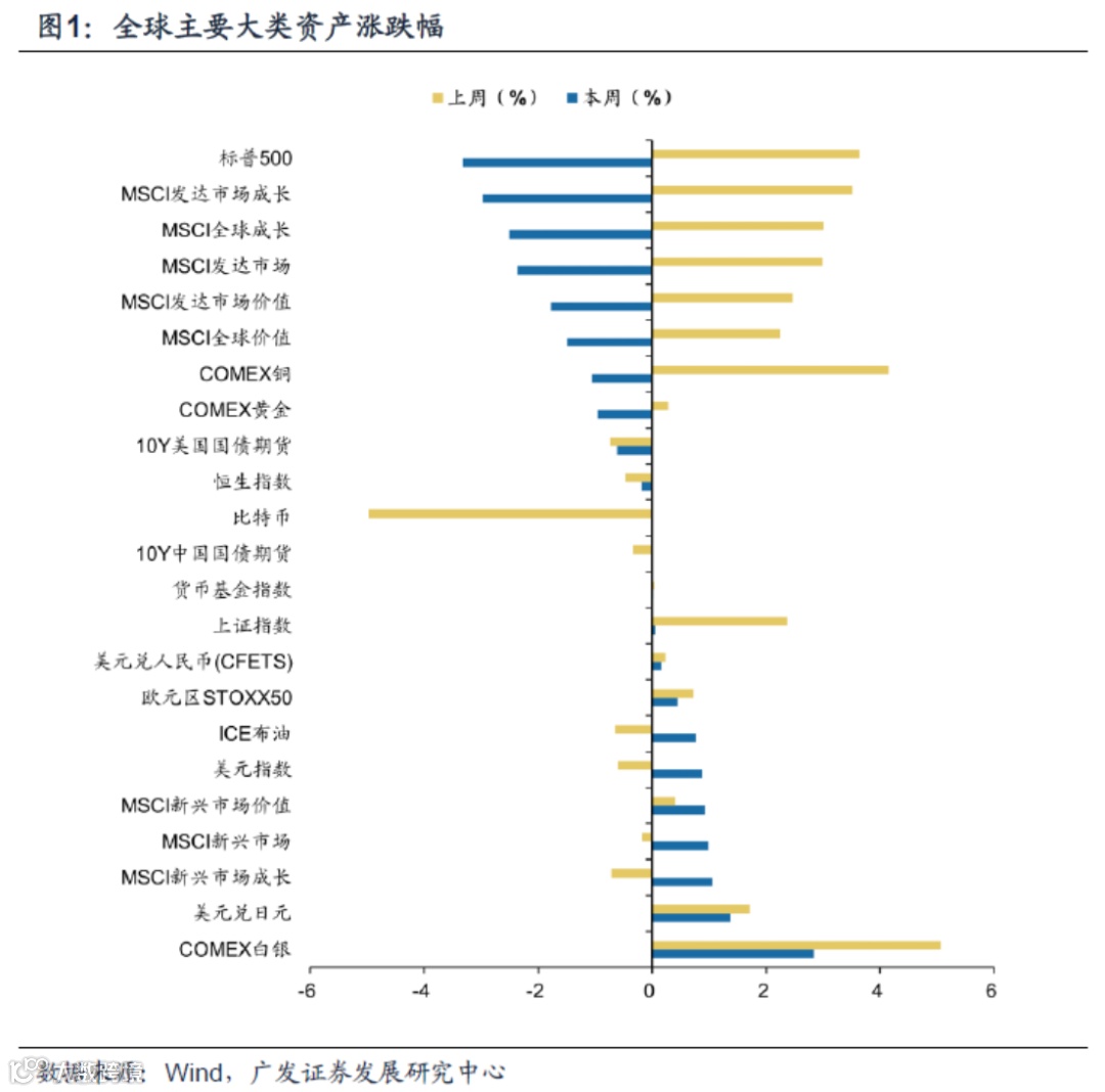 (2)上周大类资产表现:商品>发达>新兴>美元>债券>比特币。上周贵金属领涨:COMEX白银(涨5.06%),其次是COMEX铜(涨4.15%)、标普500(涨3.65%)。跌幅最大为比特币(跌4.97%),其次是10Y美国国债期货(跌0.74%)、MSCI新兴市场成长(跌0.71%)。