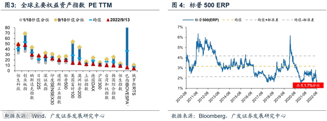 (3)主要权益资产估值较上周有所上升。截至9月13日,全球主要权益资产估值最高为:恒生科技49.6倍(90.5%历史分位)、创业板指48.2倍(35.6%历史分位)、纳斯达克指数30.3倍(38.5%历史分位),最低为:俄罗斯RTS指数4.6倍(6.4%历史分位)、恒生指数9.3倍(21.7%历史分位)、韩国综合指数10.1倍(8.7%历史分位)。