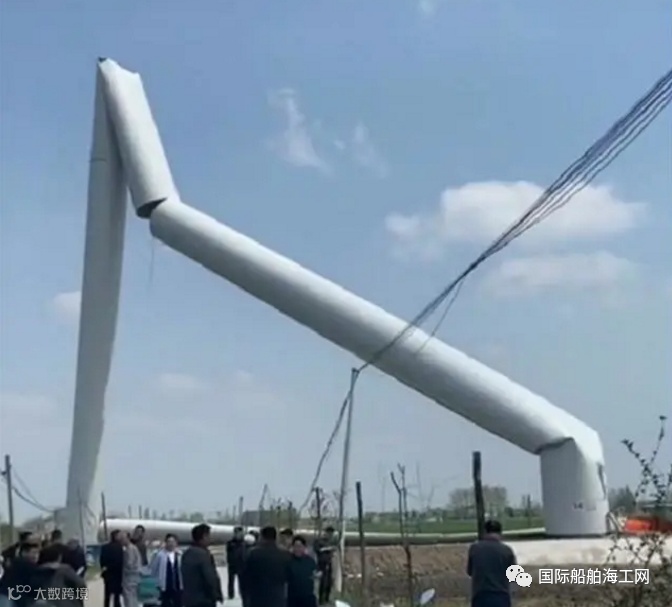 4月10日中午 11 时许,位于扬州高邮市汤庄镇境内的一座百余米高的风力发电机突然倒塌。现场看到,百米高的风力发电机塔断成了三四节,横跨道路,直接倒在了路边的河内。巨大的风叶砸在了路面上,导致道路护栏和电线受损。