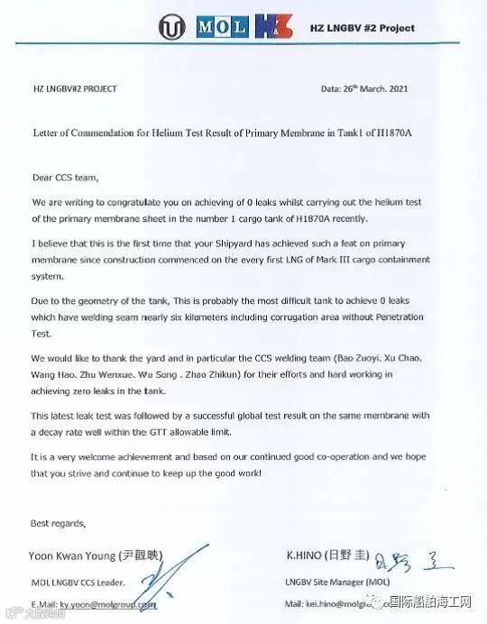 日前,18600立方米LNG加注船日本船东MOL建造组发来表扬信,祝贺沪东中华取得该船1号舱MARK III型围护系统主膜氦气试验首次零漏点的佳绩,称赞总装二部围护系统团队建造工艺先进,焊接技术精湛,对项目组付出的辛勤努力表示感谢。