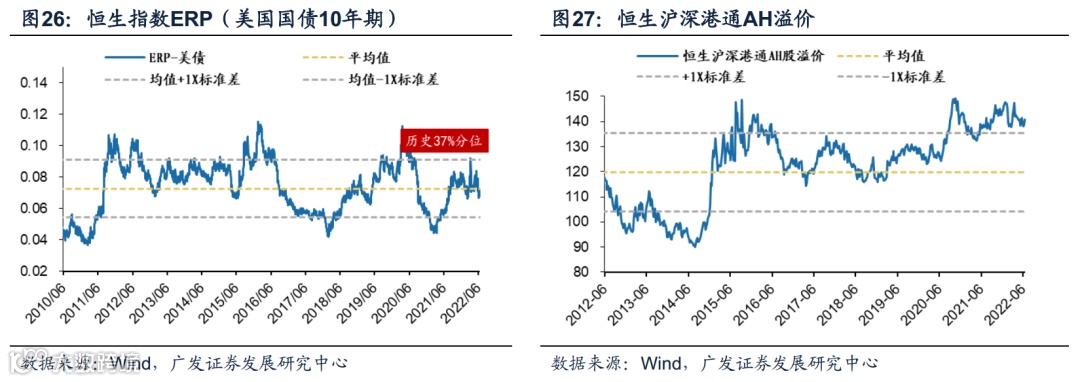(3)截止6月21日,对标10年期中债和美债利率的恒生指数ERP分别为7.3%、6.8%,分别位于历史80%、37%分位数。恒生沪深港股通AH溢价位于141.32绝对水平,分位数处于历史92.1%分位。