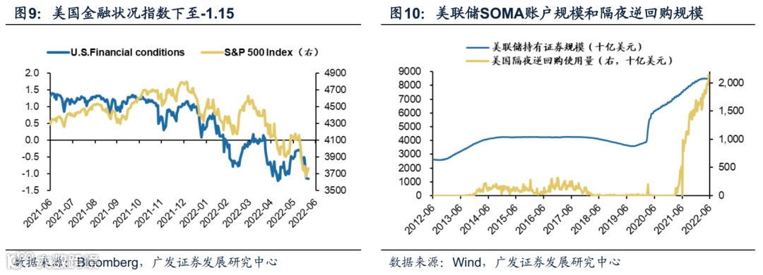 (1)美联储加快紧缩步伐。6月16日,美联储公布6月议息决议,宣布上调联邦基准利率75BP至1.5%-1.75%,为1994年以来单次最大加息幅度,FOMC表示有强烈的意愿控制通胀水平。6月以来,美国进入量价配合的紧缩阶段,目前正在以每月475亿美元(300亿美元国债+175亿MBS)的规模缩表,三个月之后上限提高至950亿美元(600亿国债+350亿MBS和机构债)。但短期看,隔夜逆回购数量仍达2.163万亿美元,可作为“缓冲垫”对冲缩表带来的流动性紧缩。