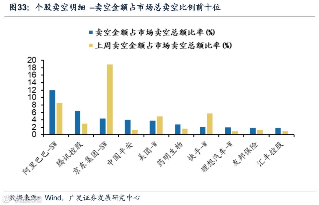 (2)6月21日共623只港股被卖空(6月17日为650只),总卖空金额为178.3亿港元(6月17日为280.5亿港元),其中卖空金额超1亿港元的个股有32只(6月17日为41只)。本周卖空金额占市场总卖空比例居前五的个股包括阿里巴巴、腾讯、京东、中国平安、美团,其中阿里巴巴12.00%处于第一位;上周卖空金额占市场总卖空比例居前五的个股为京东、阿里巴巴、快手、美团、腾讯,其中京东18.83%处于第一位。