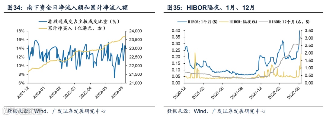 (1)南下资金持续净流入,交易活跃度占比小幅上升。截止6月21日,本周南下资金累计净流入15.45亿元,成交额占港股成交日均比例为14.29%,上周为累计净流入195.57亿元,日均成交额占比13.43%。
