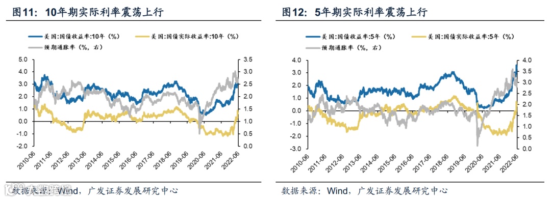 (2)美债利率冲高回落,维持高位运行,实际利率上行明显。截止2022年6月21日,美国5年期和10年期国债利率分别为3.38%和3.31%,在超预期通胀带来剧烈紧缩预期的带动下,美国10年期国债收益率于上周6月14日最高触及3.5%。美联储收紧货币政策是近期美债收益率上行的主要原因,表现为实际利率上行明显。