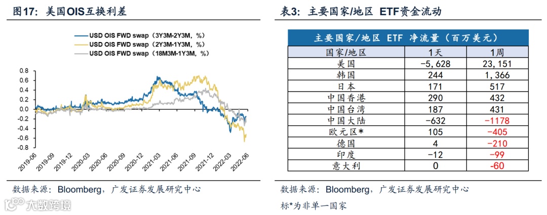(6)美国远期互换利差显示23年H2有1次降息预期。截止2022年6月21日,USD OIS FWD swap(3Y3M-2Y3M)达-0.1479%,USD OIS FWD swap(2Y3M-1Y3M)达-0.5249%、USD OIS FWD swap(18M3M-1Y3M)达-0.2636%,反应市场预期23年H2美联储会有1次降息。