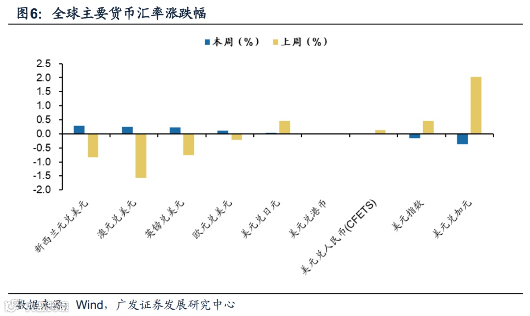 (1)本周美元指数小幅下跌,美元兑多数国家货币汇率下降。本周美元(跌0.16%)小幅回落,美元兑其他货币汇率均有下降。截至6月21日,新西兰兑美元(涨0.29%)、澳元兑美元(涨0.25%)、英镑兑美元(涨0.24%)、欧元兑美元(涨0.12%)上涨,美元兑人民币(跌0.02%)、美元兑加元(跌0.36%)下跌。