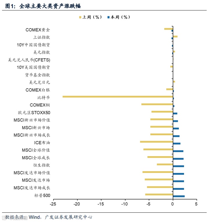 (1)本周大类资产表现:发达>新兴>商品>债券>美元>黄金。在上周金融条件紧缩带来悲观预期的影响下,多数资产大幅下跌,本周有所反弹。标普500(涨2.45%)领涨,其次为MSCI发达市场成长(涨2.33%)、MSCI发达市场(涨2.32%)、MSCI发达市场价值(涨2.31%);原油价格走高,本周上涨1.56%。跌幅最大为黄金(跌0.31%)、上证指数(跌0.30%)、10Y中国国债期货(跌0.20%)、美元指数(跌0.16%)。