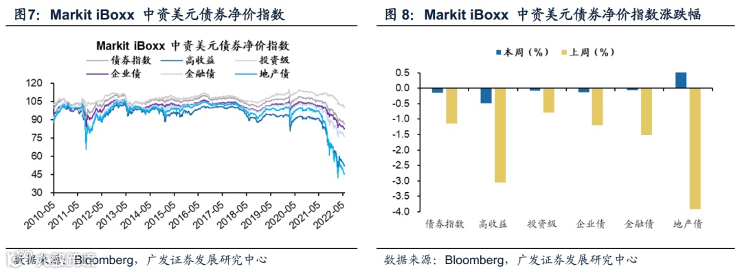 (1)本周Markit iBoxx中资美元债券净价指数延续下行趋势。中资美元债券指数较上周下跌0.14%,细分项目中仅地产债(涨0.74%)见反弹趋势,其余高收益债(跌0.49%)、企业债(跌0.14%)、投资级债(跌0.07%)、金融债(跌0.06%)均有不同程度下跌。上周Markit iBoxx中资美元债券指数下跌1.15%,地产债指数(跌3.92%)跌幅最为明显,高收益债(跌3.06%)、金融债(跌1.52%)、企业债(跌1.20%)、投资级债(跌0.78%)均有较大程度下跌。