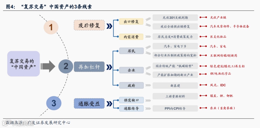 (四)A股“此消彼长”独立行情关注“复苏交易”中国资产的3条主线:疫后修复+再加杠杆+通胀受益。疫后修复:我们在5.25《盈利寻底,利润率再向上游聚拢》中指出“疫后修复”物流/制造/贸易/消费的景气预期将结构性改善——(1)制造修复建议关注外需中国供应链的全球优势(光伏产业链)以及疫后供应链修复和需求韧劲(汽车及零部件/半导体设备)。(2)消费修复建议关注居民自发+消费政策发力方向(医美化妆品)。再加杠杆:我们在5.26《如何“再加杠杆”稳住经济大盘?》中判断:“稳增长”进入“再加杠杆”新阶段。决策层致力于恢复中国经济活力,部分行业压制性政策将会转向宽松——(1)居民再加杠杆:消费限制性政策转向宽松(互联网传媒/创新药/地产),以及消费支持性政策受益(汽车/家电)。(2)企业再加杠杆:重点关注民企信用环境改善,景气预期高位回升的科技新兴产业产能扩张“再加杠杆”的潜力(锂/电池化学品)。(3)政府再加杠杆:建议关注新基建(风光/IDC)的投资机会。通胀受益:我们在春季策略展望中判断:俄乌冲突加速“逆全球化”,加剧“滞胀”——4.28《上游周期:“供需稳态”重塑估值》提示:新能源链的投资/生产/使用,既会增加传统能源/材料的需求,也已对传统能源/材料投资形成“挤出效应”,上游资源/材料(煤炭/锂/钾肥)“供需稳态”将迎来估值向上重塑。5.5《盈利寻底,利润率再向上游聚拢》指出:养殖业资本开支持续收敛,将支撑利润率水平改善。