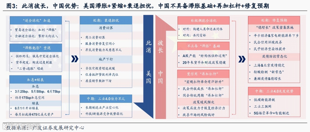 ● “此消彼长”的中国优势是A股独立行情的基础。(1)此消:“逆全球化”供给收缩/20年疫情以来货币和财政政策过度刺激/“工资-通胀”螺旋,美国“滞胀”重现。俄乌冲突加速“逆全球化”,加剧美国“滞胀”压力。滞胀+紧缩导致美国经济衰退担忧。(2)彼长:中国积极拥抱全球化,稳健的货币和信用政策以及22年A股结构性“供给过剩”缓和通胀压力。宽信用“再加杠杆”/恢复经济活力政策,改善经济修复预期。中期来看,中国低碳新能源+5G场景革命抢占“工业4.0”时代先机。