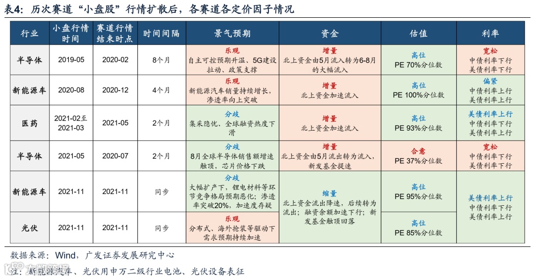第四,出现小盘股扩散行情可视为微观结构欠佳、预期分歧放大,后续赛道行情持续性将对景气趋势、增量资金(主要为北上)和流动性预期将提出更高要求。例如,19年半导体扩散行情后,股价仍可上涨8个月,背后是三因素的共振。受国产替代预期催化、5G建设拉动叠加所得税减免等政策驱动,景气趋势持续强劲;同时,北上资金重新转为流入,增量资金支撑;最后,中债及美债利率下行,流动性预期宽松。而21年末的新能源汽车在扩散行情后便股价见顶,背后是三因素的恶化。景气预期来看,市场担忧锂电材料为首的环节在大幅扩产后22年潜在竞争格局恶化、价格下跌;同时,新发基金转为下行、两融余额加速下降、北上资金流入放缓,增量资金衰减。最后,美债利率上行对估值端形成挤压。其余赛道行情多持续2-4个月,背后是1-2个因素也出现了边际恶化。例如,20年8月新能源汽车行情扩散,此后虽景气预期乐观,但中债、美债利率均上行,流动性预期不利;21年5月半导体行情扩散,此后虽流动性预期、增量资金支持,但在销售额见顶、芯片下跌之下,景气预期隐忧。