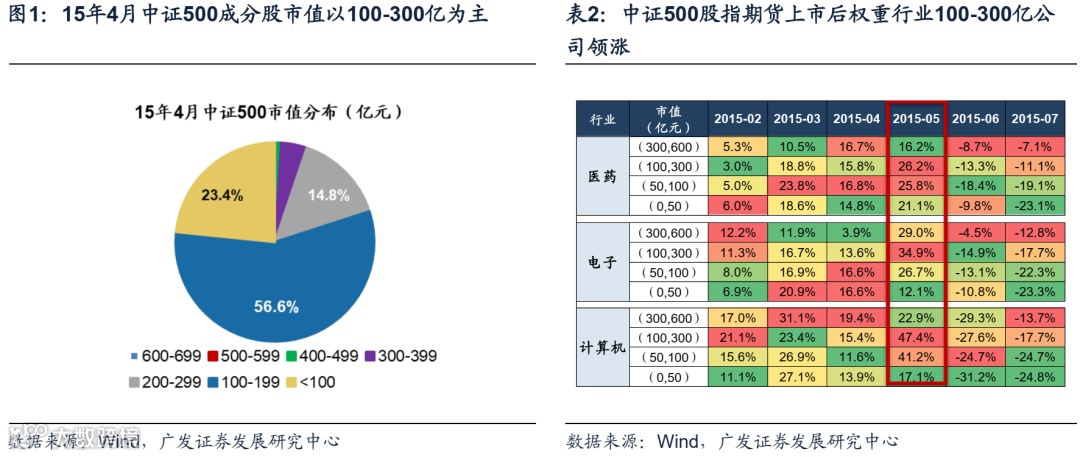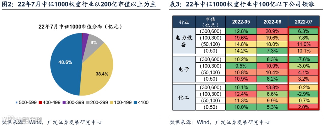 第一,7月上市的中证1000股指期货进一步带动了资金及风偏预期。7月22日中证1000股指期货正式上市,提振小市值公司行情。对比15年4月中证500股指期货上市,股指期货上市对小市值公司拉动作用较为显著。15年4月中证500权重股以100-300亿市值为主,占比达71.4%,而股指期货上市后,中证500权重行业,如医药、电子、计算机等,均是100-300亿公司领涨。同样,22年7月中证1000股指期货上市,成分股市值多分布于200亿以下,占比达87.0%,其中100亿市值以下公司占比达48.6%。7月来看,指数权重行业电力设备、电子、化工等均为100亿以下公司领涨。