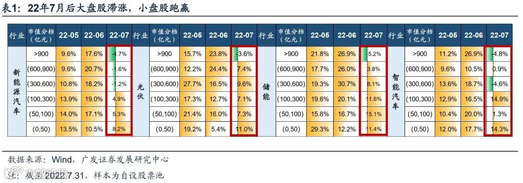 ● 7月以来,以新能源领域为代表的赛道行情向100亿市值以下的“小盘股”扩散。