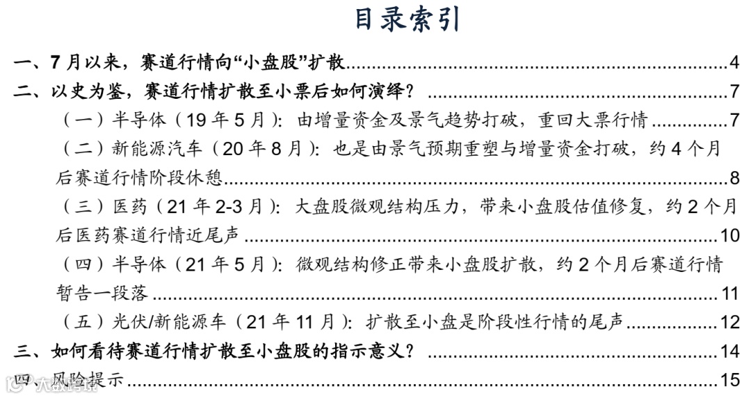 历史来看,赛道股行情向百亿市值以下“小盘股”扩散并不罕见,主要在19年后出现5段典型时期:(1)半导体(19年5月):扩散行情持续约1个月,此后随着产业趋势强劲仍成立,增量资金(北上)驱动半导体行情重回大盘风格,上涨行情继续持续8个月,后续涨幅达154.6%;(2)新能源汽车(20年8月):扩散行情持续约1个月,主要由估值扩散修复驱动。此后产业景气预期上修、宏观经济复苏、增量资金流入下,行情重回大盘风格,上涨持续4个月,后续涨幅为35.9%;(3)医药(21年2-3月):大盘股微观结构压力,带来小盘股估值修复,扩散约2个月,此后微观结构修正、宏观经济复苏、增量资金流入下,医药重回大盘风格,并在约2个月后行情近尾声;(4)半导体(21年5月):微观结构修正带来小盘股扩散,持续约1个月。此后重回大盘风格,上涨行情也仅持续2个月,后续涨幅为41.8%。(5)光伏/新能源车(21年11月):扩散至小盘是阶段性行情的尾声。受估值优势、产业优势驱动,下沉行情持续1个月。此后在增量资金衰减、景气预期分歧、美债利率压制之下,新能源汽车、光伏行情终结。叠加22年上半年A股震荡下行,两个赛道均下跌5个月,跌幅分别达-43.2%、44.1%。