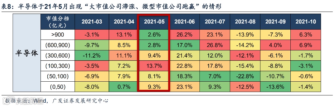 21年5月,半导体由前期龙头领涨转为小市值公司跑赢,大盘股微观结构修正,产业趋势强劲支持市场向小盘股切换。同样是21年年初微观结构恶化带来的大小市值切换,但由于景气趋势依然存在,所以市场向小盘股寻求扩散。