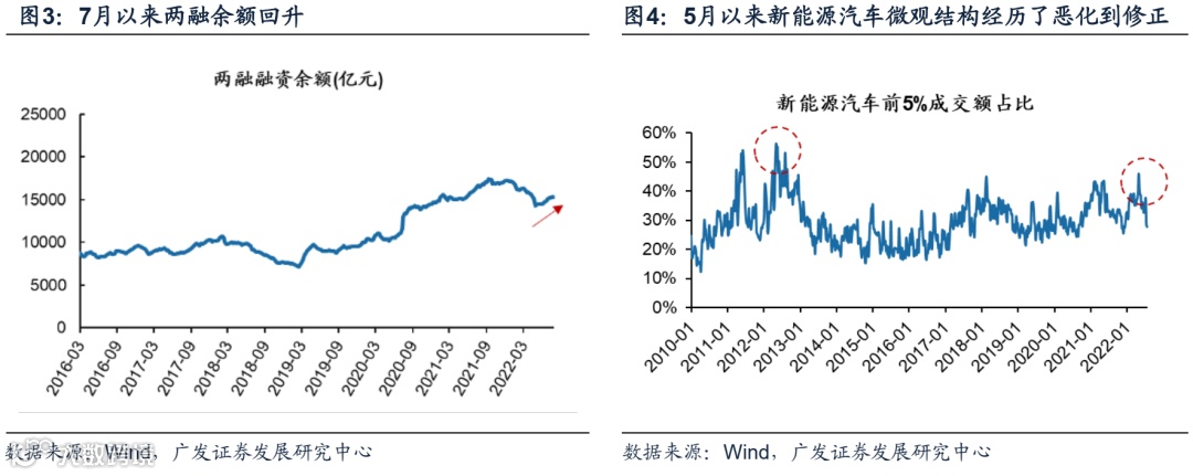 第二,自4月下旬大幅反弹以来,主流赛道龙头标的估值快速修复、成交额占比到达历史高位、微观结构欠佳,在此背景下增量与存量资金更寻求扩散机遇。以新能源汽车为例,前5%成交额占比至5月到达了历史高位后回落,7月15日以来回落加速,体现了市场微观结构有所修正。