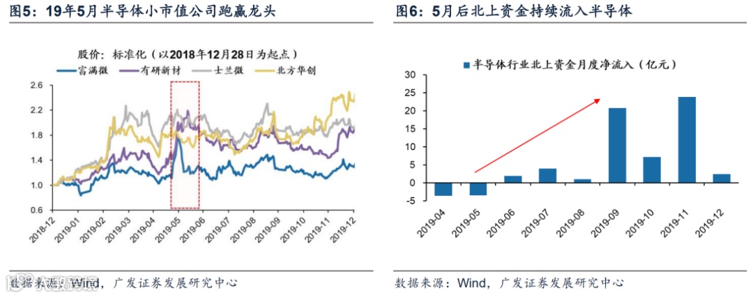 短暂1个月后,随着整个半导体产业趋势的强劲趋势依然成立,增量资金(北上+新发基金)驱动半导体行情重回大盘风格,上涨行情继续持续8个月,后续涨幅达154.6%。首先,半导体景气预期抬升,贸易战强化“自主可控、国产替代”预期,叠加减税政策支撑及5G建设周期驱动,成为彼时半导体坚实的投资主线;其次,增量资金持续流入,主要受北上资金提振。19年5月北上资金从半导体流出3.5亿元,而至6月重新转为流入,当月流入2.0亿元,此后7月继续流入4.0亿元。