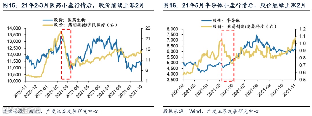 第一,赛道股行情扩散,龙头滞涨、小票跑赢行情是一个过渡状态,一般持续为1-2个月。历史来看,赛道股“微型公司”行情扩散多持续1个月,持续性不长。仅存在微观结构压力的21年2月医药持续了2个月。
