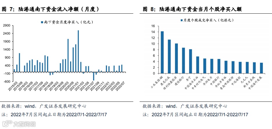 2022年7月(截至7月17日),南下资金净流出13亿元。当月净买入个股前五为小米集团-W、康龙化成、保利协鑫能源、建设银行、李宁。