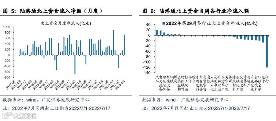 (5)陆港通北上资金流入净额:上周陆股通北上资金净流出220亿元,前一周净流入36亿元。截至2022年7月17日,2022年7月北上资金净流出185亿元。上周净流入行业前五名是汽车、电力设备、建筑装饰、机械设备、钢铁,净流出行业前五名是银行、电子、非银金融、食品饮料、有色金属。