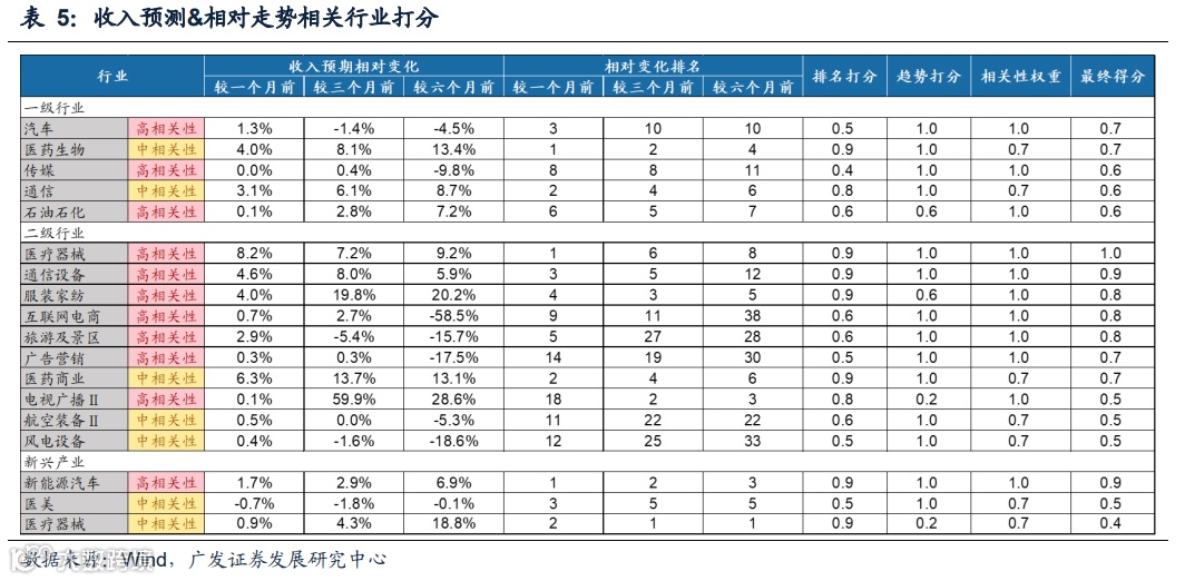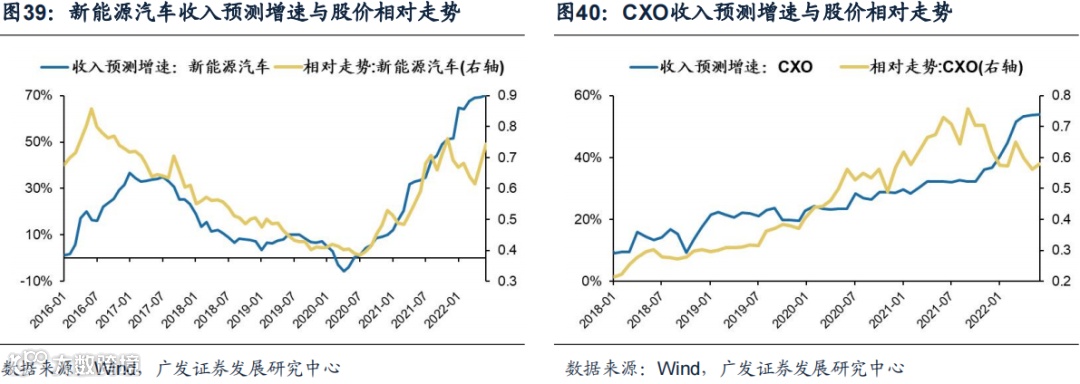 新能源汽车、CXO的收入景气预期与相对走势具有高相关性,光伏、医美、医疗器械、智能汽车的收入景气预期与相对走势具有中相关性。