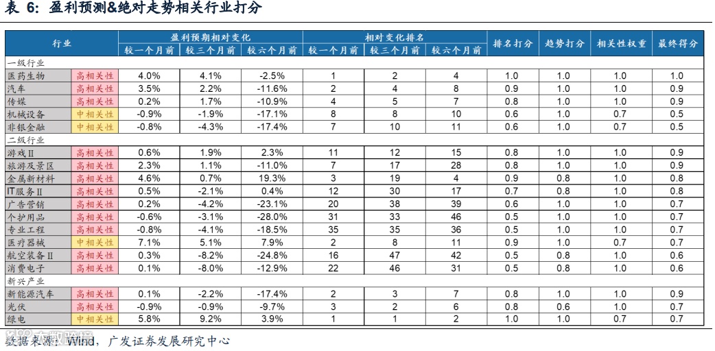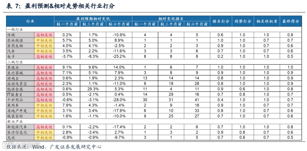 对各行业的“景气预期”四维度最终得分进行平均汇总,按照相关性数量调整后,排序得到当前景气预期对股价指引效果最佳的前五一级行业,前十二级行业及前三新兴产业,结果分别为: