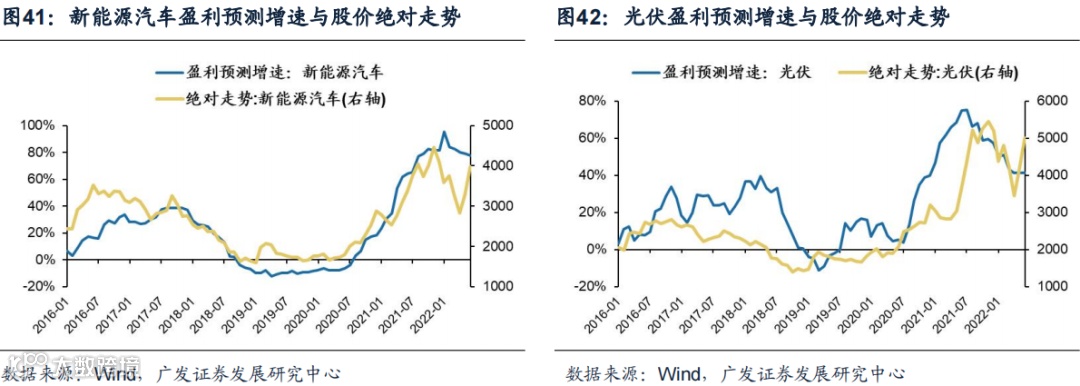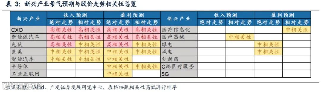 新能源汽车、CXO、光伏的盈利景气预期与绝对走势具有高相关性,医美、智能汽车、半导体、工业互联网、绿电、风电的盈利景气预期与绝对走势具有中相关性。