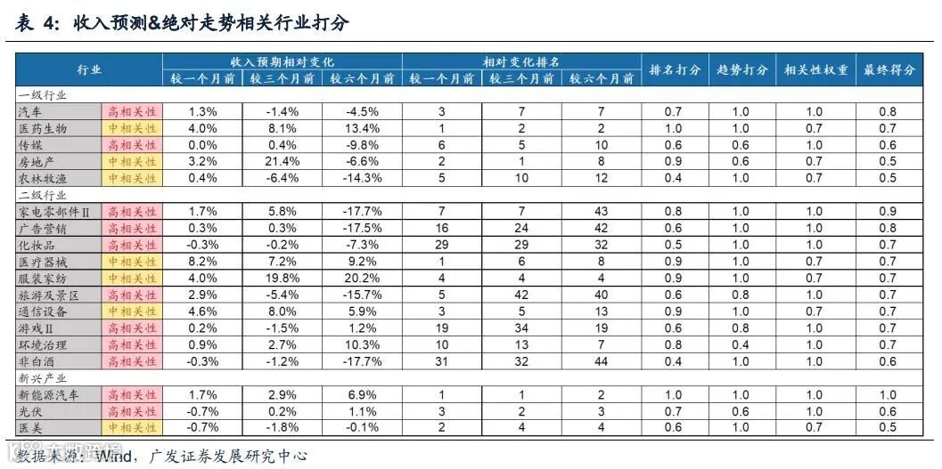 剔除负相关与无相关行业后,对相关性为正的行业按照①收入景气预期-绝对走势 、②收入景气预期-相对走势、 ③盈利景气预期-绝对走势 、④盈利景气预期-相对走势 四个维度进行打分排序,判断各行业当前景气度对股价指引效果的强弱。
