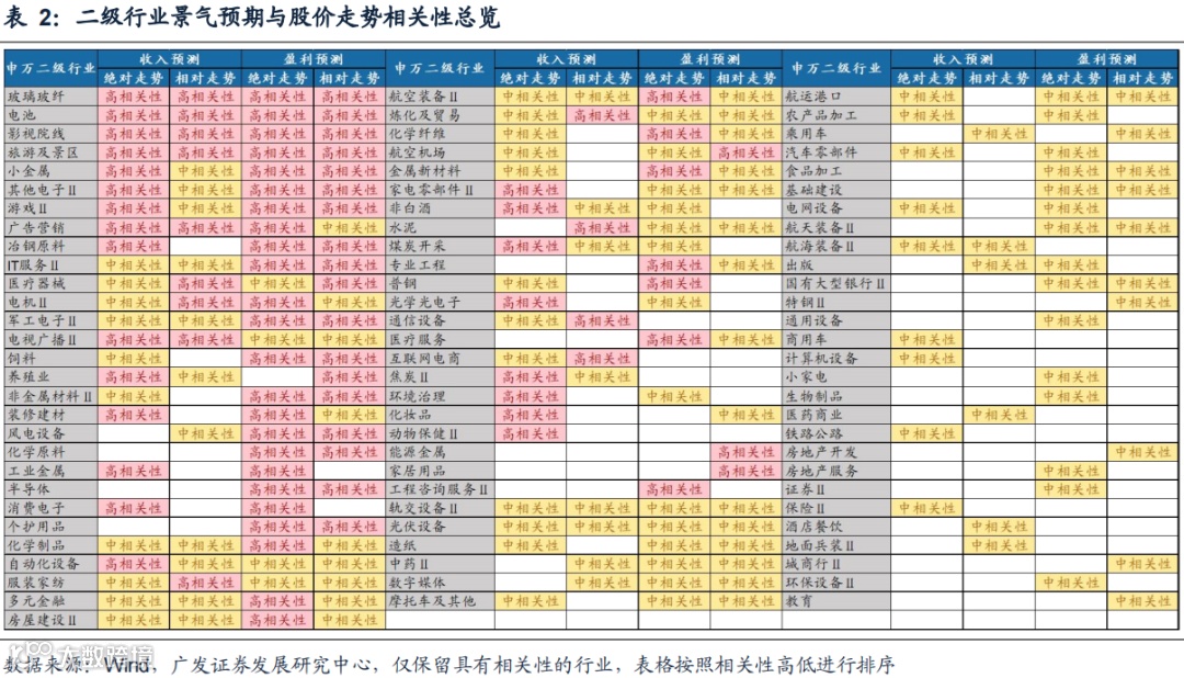 二级行业中,分别有31个和33个行业的盈利景气预期与股价绝对走势具有高相关性或中相关性,其中高相关的行业按照行业风格分类如下: