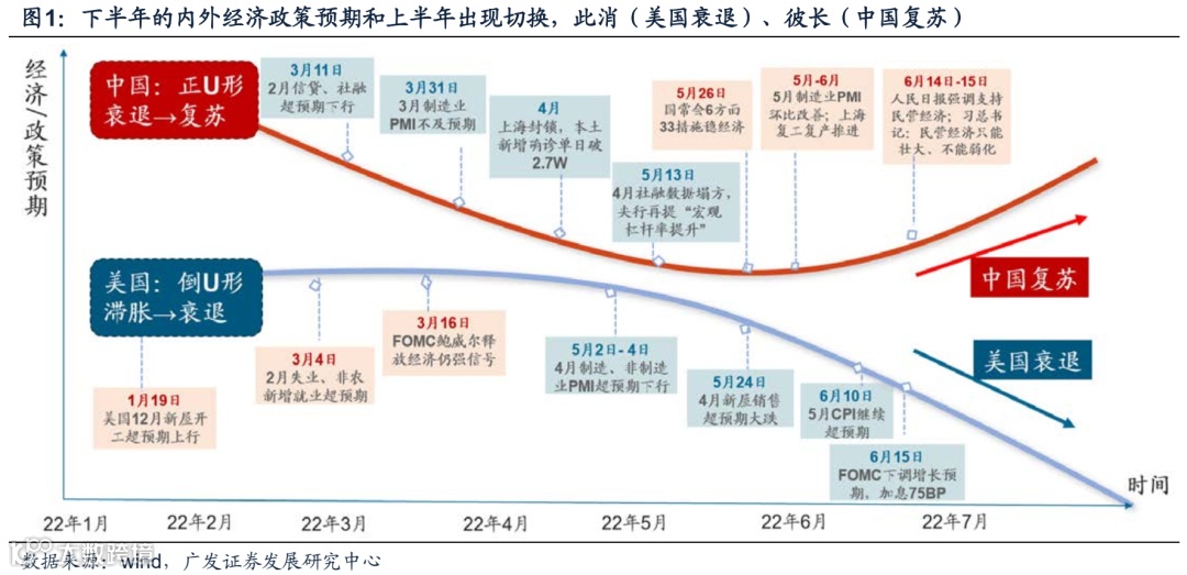 我们自6月以来持续提示,中国及海外经济运行形态和政策储备从容性再度错位,“此消彼长”格局下中国资产逐渐具备全球相对优势,是捕捉A股结构性机遇的线索。我们在6.19《“此消彼长”独立行情的三条主线》(点击标题查看原文)中强调“此消彼长”的中国优势是A股独立行情的基础;在6.25《A股22年中期策略展望:此消彼长,水到渠成》(点击标题查看原文)进一步阐述了中美经济周期再度错位及中国政策储备的从容性带来了资产比价优势:美国经济形态“倒U型”,从滞胀到衰退,5月之后美国“通胀魅影”难消,政策腾挪空间有限而衰退压力升温;中国经济形态“正U型”,从衰退到复苏,决策层持续释放恢复经济活力的信号。