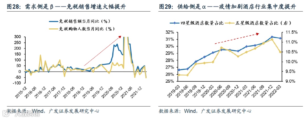 从20年以来的疫后消费复苏行情可见,消费行业存在结构性机会的逻辑在于:广谱的内需修复支撑板块β,而供给优化及龙头份额提升驱动α。一方面,需求侧的景气改善形成支撑,如外需回流的免税购物需求、社交属性的白酒消费需求、品牌升级的国潮消费需求等;另一方面,高端化、品牌连锁化、产品创新驱动龙头公司份额提升,供给结构改善支撑消费品类走出α机遇。例如,20年后白酒、啤酒受高端化提振,茅台、青啤等标杆产品均于20年后持续涨价,驱动利润率抬升;品牌化、连锁化带动爱尔眼科/通策医疗等眼科及口腔龙头市占率不断抬升;酒店及旅游行业,供给侧的出清凸显龙头公司的经营稳定性。