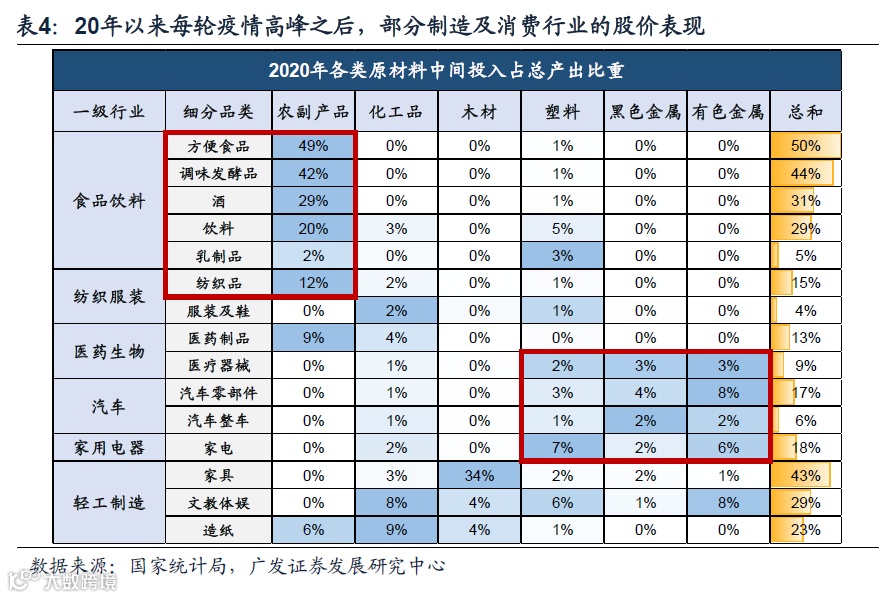 以主要原材料投入占比超过15%来观测,食品饮料原材料敏感度最高,敞口主要在农副产品,尤其是食品项,农产品投入占比超过40%。同时,家电、家具、文教体娱用品、造纸、纺织品、汽车零部件的原材料投入占比均超过了15%。不同行业的原材料敞口结构不同。原材料投入占比结构来看,食品饮料农产品投入高,汽车零部件、家电、文教体娱用品的有色金属、塑料投入高,家具的木材投入高、造纸的化工品投入高。