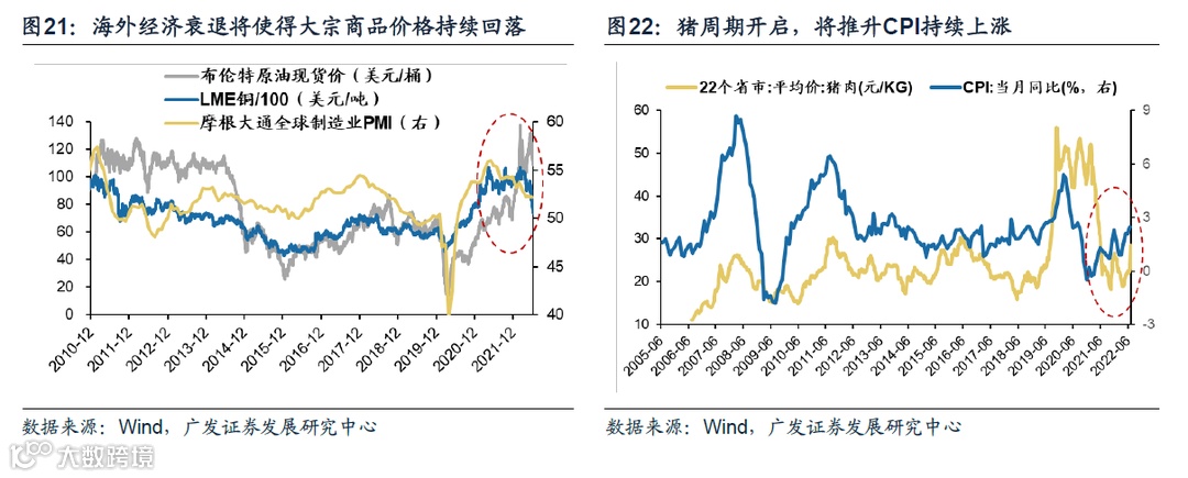 海外衰退预期对应大宗商品的顶部确立,基数压力下PPI下行、而猪价推升CPI,22年下半年将加速演绎PPI-CPI的剪刀差收敛。今年上半年俄乌冲突加剧海外大宗品韧性、疫情扰动使终端消费需求不振,因此通胀链条自上游向中下游的传导不畅。展望下半年,海外衰退叠加高基数将带动PPI增速继续回落,而猪价上涨使得5月CPI上行超预期,PPI-CPI趋势下的投资逻辑将逐渐引起重视。一方面海外经济由滞胀转为衰退,大宗商品价格基本确定顶部回落趋势。截至7月13日,原油、铜、铝价格自3月高点已分别下跌21.0%、32.3%、41.2%。同时叠加去年下半年高基数,PPI同比增速回落趋势较为确定。另一方面,当前能繁母猪存栏同比增速已连续下滑14个月,产能去化叠加需求回暖之下,猪价涨幅于6月开始加速抬升。截至7月8日,22省市平均猪价已较6月低点上涨30.0%,下半年将继续推升CPI上行趋势。