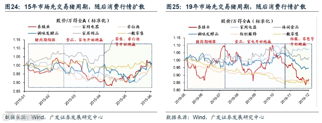 节奏上看,15年和19年的PPI-CPI剪刀差收敛时期,消费板块行情呈现“交易猪周期上行→交易PPI成本回落→行情扩散交易CPI”的特点。15、19两轮通胀周期来看,养殖业均率先领涨,一般持续1-2个月左右。此后,由于成本缓解带来的利润率改善更为确定,市场交易PPI逻辑,成本项更为相关的家电、食品等开始跑赢;最后,CPI通胀受益下的消费行情扩散,与终端CPI涨价更相关的一般零售(商超/百货等)、纺服、非白酒等行业开始跑赢。