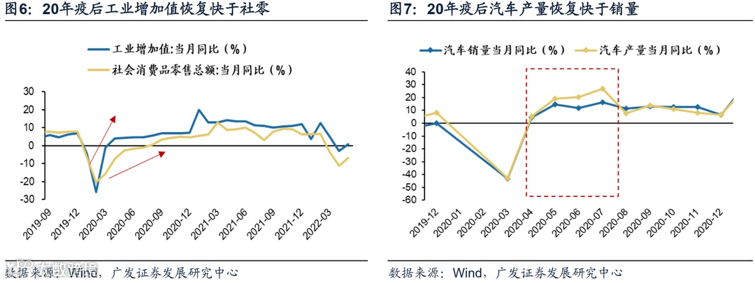 借鉴20年疫后修复经验,由于供给的复苏快于需求,呈现先制造(供给)、后消费(需求)的修复时序。20年2月主要经济数据陷入低谷,生产端的工业增加值同比增速于4月即转正,而消费端的社零同比转正则待至9月。以20年汽车行业为例,疫后的4月-7月其产量增速的修复持续高于销量增速。