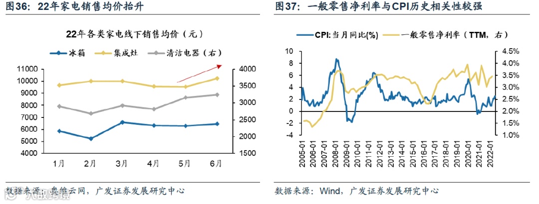 (1)啤酒: 21年末啤酒涨价以对冲成本上涨,随着下半年CPI上行,预计22Q2后提价将继续在终端传导。长期来看啤酒的产业趋势仍是高端化,提价趋势有望延续。(2)家电:今年以来,家电仍延续着20Q4以来的终端提价趋势。据奥维云网,以冰箱/集成灶/清洁电器为例,截至6月三者价格分别较年初上涨10.5%/5.9%/11.9%。因此,家电是成本缓解与终端提价的双重受益行情。(3)零售:15年、19年两轮可比PPI-CPI剪刀差收敛区间来看,一般零售均会在区间后段有跑出超额收益,背后是终端提价会最终传导至商超、百货等的利润率增厚之上。历史来看,一般零售净利率与CPI相关性较强。因此,中期可关注零售板块的提价受益。